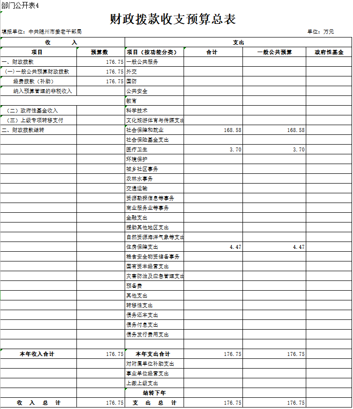 2、隨州市委老干部局(機關)2019年財政撥款支出預算176.75萬元,較去年增加99.22萬元,增加128%。增加原因主要為本年度的125萬元的項目經費中的110萬上年作為財政社保科的預算,今年直接在市委老干部局預算中編制,導致預算增加。
