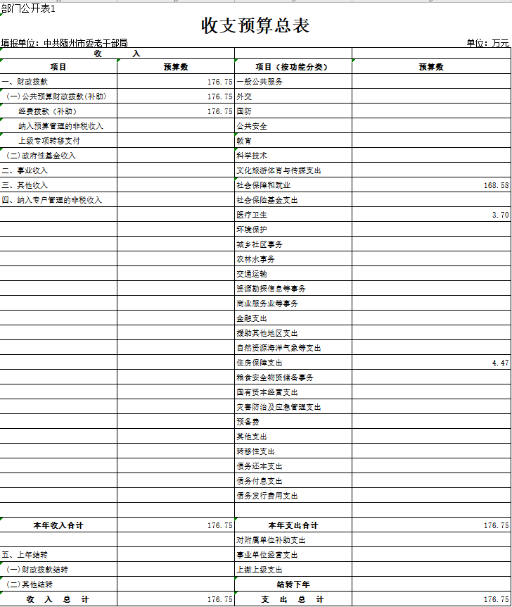 2、隨州市委老干部局(機關)2019年收入預算總額為176.75萬元,全部為財政撥款(補助)收入。較上年預算安排增加86.98萬元,增加96.9%,增加原因主要為本年度的125萬元的項目經費中的110萬上年作為財政社保科的預算,今年直接在市委老干部局預算中編制,導致預算增加。