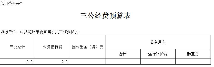 2020年中共隨州市委直屬機關工作委員會“三公”經費預算合計2.84萬元,其中,公務接待費2.84萬元。新成立單位,無上年對比。