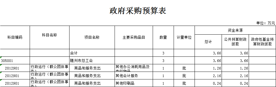 本年部門安排政府采購預算支出3.66萬元,其中:財政撥款的政府采購預算支出3.66萬元,較上年預算安排增加了3.66萬元,比上年預算安排增加了100.00%,主要原因為本年新增并納入了政府采購范圍的采購品類。