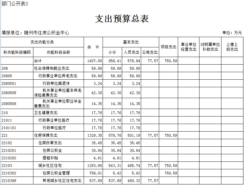 2020年支出預算總額1407萬元,較上年增加287萬元、增加25.63%。其中:基本支出656.41萬元、項目支出750.59萬元。基本支出中人員支出578.84萬元、公用支出77.57萬元。支出總額增加的主要原因:一是公積金專項運營經費中新增了隨縣辦事處業(yè)務用房購房費(尾款)及裝修費。二是人員費用晉級增長。