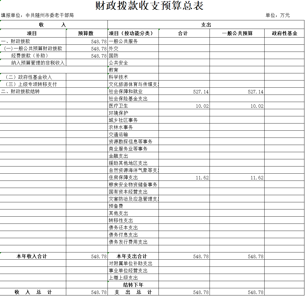 2、隨州市委老干部局(機關)2020年收入預算總額為548.78萬元,全部為財政撥款(補助)收入。較上年預算安排增加372.03萬元,增加210%,增加原因主要為機構改革后,老干部局編制人員增加5人,同時2020年新增300萬項目經費用于老年大學建設,導致預算增加。