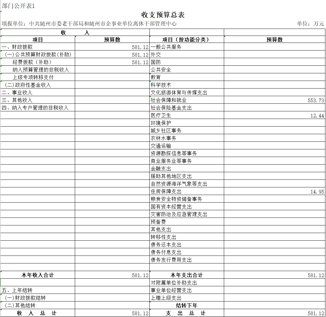 1、隨州市委老干部局(含隨州市企事業單位離休干部管理服務中心)2020年收入預算總額為581.12萬元,全部為財政撥款(補助)收入。較上年預算安排增加372.79萬元,增加179%,增加原因主要為機構改革后,老干部局編制人員增加5人,同時2020年新增300萬項目經費用于老年大學建設,導致預算增加。