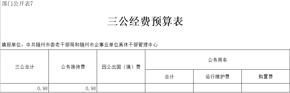 ??1、隨州市委老干部局(含隨州市企事業單位離休干部管理服務中心)2020年“三公”經費年初預算安排0.98萬元,與上年相比增加0.45萬元,增幅45.92%。其中: