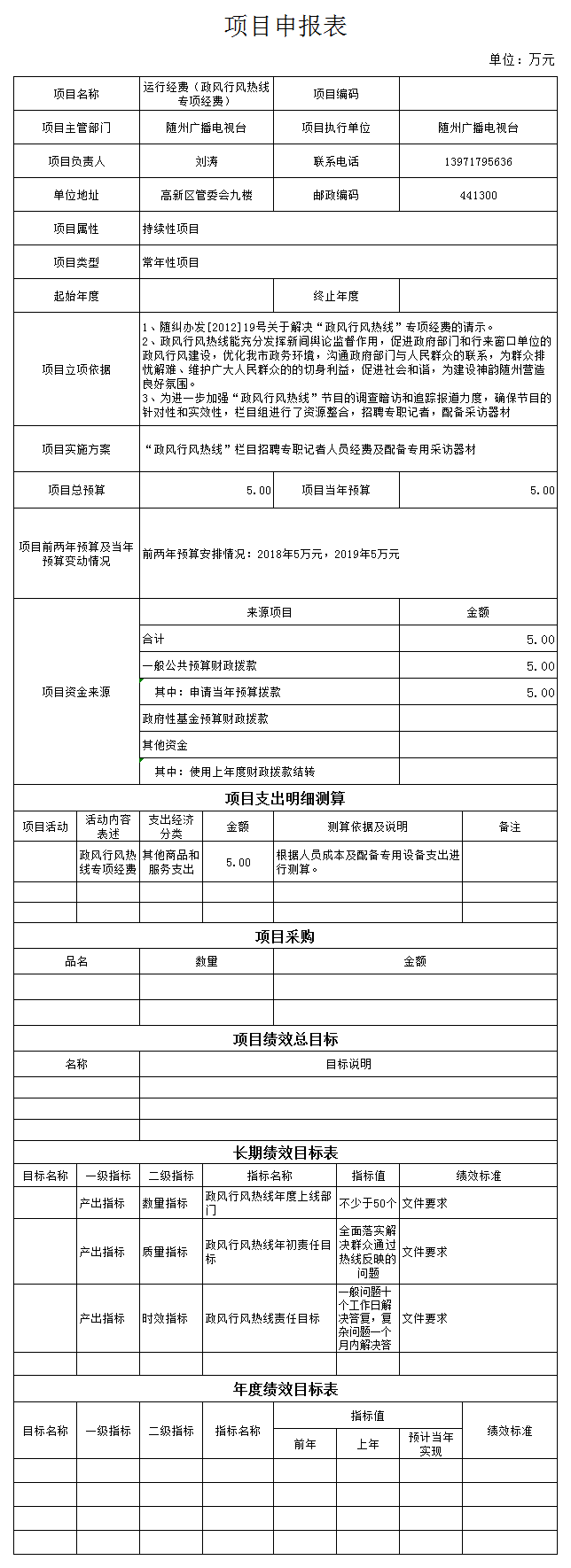 “政風行風熱線”專項經費5萬元,該專項經費為支付“政風行風熱線”欄目招聘專職記者人員經費及配備專用采訪器材。為充分發揮政風行風熱線的新聞輿論監督作用,促進政府部門和窗口單位的政風行風建設,優化我市政風環境,溝通政府部門與人民群眾的聯系,為群眾排憂解難、維護廣大人民群眾的切身利益,進一步加強“政風行風熱線”節目的調查暗訪和追蹤報道力度,確保節目的針對性和實效性。數量指標設定為:政風行風熱線年度上線部門不少于50個;質量指標設定為:全面落實解決群眾通過熱線反映的問題;時效指標設定為:一般問題十個工作日解決答復,復雜問題一個月內解決答復。