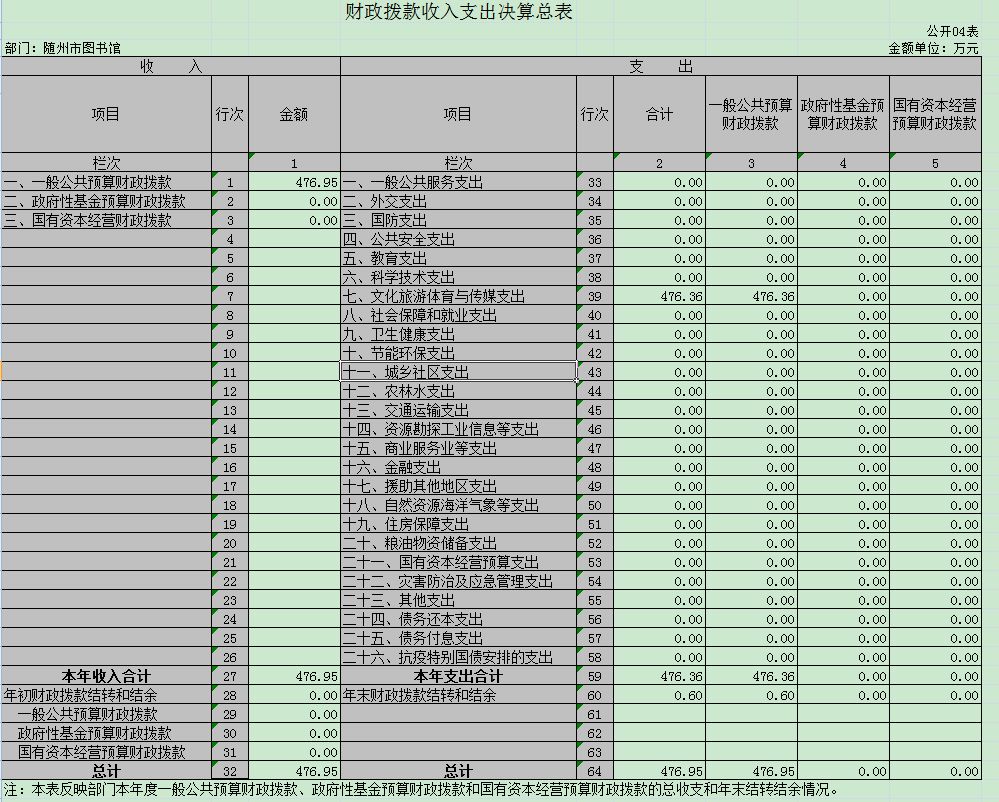 2020年度收入支出總決算476.95萬元;(1)收入總計476.95萬元,其中財政撥款收入476.95萬元;(2)支出總計476.35萬元。文化體育與傳媒支出476.35萬元,主要用于隨州市圖書館開展公益文化活動、保障圖書館事業發展而發生的項目支出和為保證日常運轉發生的支出;(3)隨州市圖書館2020年財政撥款收入476.95萬元,支出476.36萬元,其中一般公共預算財政撥款476.36萬元;(4)隨州市圖書館2020年度一般公共預算基本支出214.85萬元,項目支出261.51萬元。