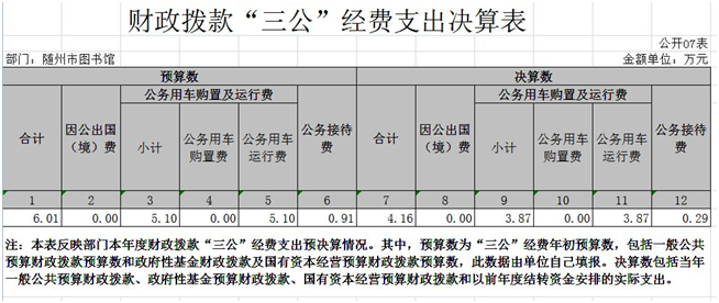 ????“三公”經費是指本部門(包括所屬行政單位、參照公務員法管理的事業單位和其他事業單位)通過財政撥款資金安排的因公出國(境)費、公務用車購置及運行費和公務接待費。隨州市圖書館一般公共預算財政撥款“三公”經費支出決算4.16元,與年初預算6.01萬元相比,減少了1.85萬元,同比減少30.78%。原因:壓縮開支。其中:(1)因公出國(境)費支出決算0萬元,與年初預算0萬元相比增加0萬元,無變化。原因:無出境業務。因公出國(境)團組數及人數為組數0組,人數0人;(2)公務用車購置及運行費支出決算3.87萬元,與年初預算5.1萬元相比減少1.23萬元,同比減少24.12%。原因:壓縮公用支出。(其中公務用車運行維護費3.87萬元,公車購置費0元,公務用車購置數及保有量為購置數0輛,保有公務用車1輛,特種專用車1輛);(3)公務接待費支出決算 0.29萬元,與年初預算0.91萬元相比減少0.62萬元,同比68%。 原因:壓縮公用支出。國內公務接待的批次4批、人數37人。