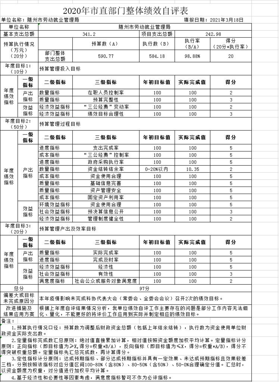附1、2020年度隨州市勞動就業(yè)管理局整體支出績效自評表