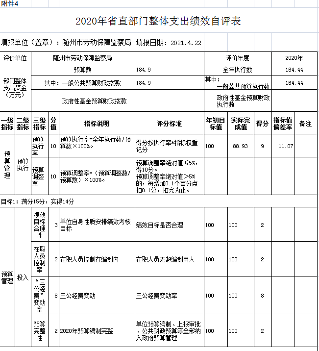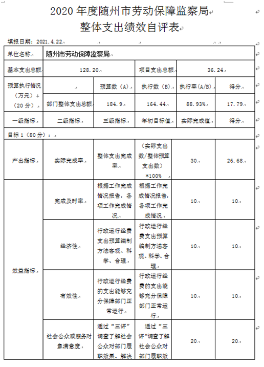 隨州市勞動保障監察局2020年度部門整體支出績效評價項目設立了明確、細化、量化的績效目標,在績效依據及績效目標安排上符合相關規定。績效評價結果級別為優,單位各項管理制度齊全,并得到了有效地實施,社會效益明顯,公共服務水平社會滿意度高。