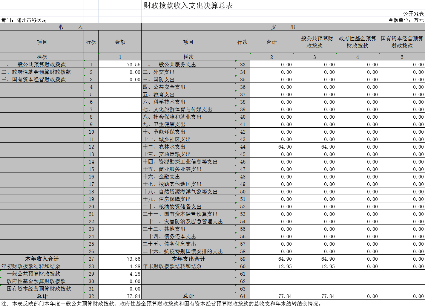 一、一般公共預算財政撥款收入 | 1 | 73.56 | 一、一般公共服務支出 | 32 | 0.00 |