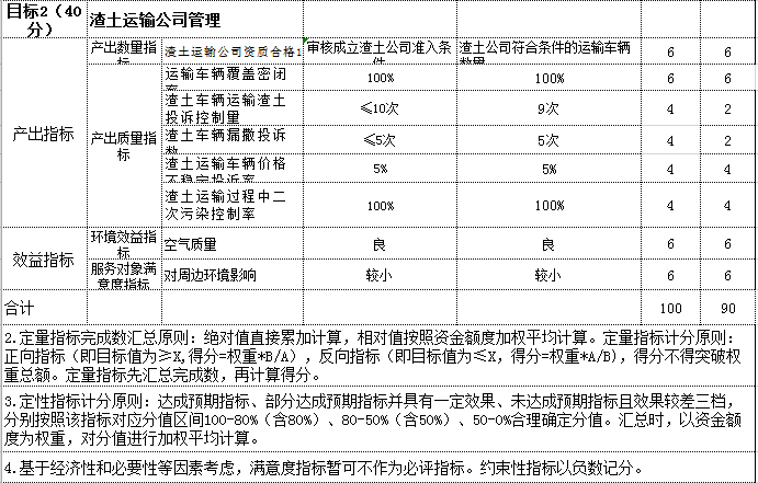 產(chǎn)出指標(biāo)滿分26分,扣4分,完成22分。具體情況是:完成全市建筑工地簽署安全生產(chǎn)責(zé)任書(shū)完成率100%,得滿分6分;道路整潔率100%,得滿分4分;建筑渣土按規(guī)定路線運(yùn)輸率100%,得4分;渣土運(yùn)輸漏撒率85%(目標(biāo)值95%,滿分4分,扣2分)得2分;建筑渣土按規(guī)定時(shí)間運(yùn)輸率95%,(目標(biāo)值100%,滿分4分,扣2分)得2分;建筑工地出入口道路人工清掃率100%,得滿分4分。