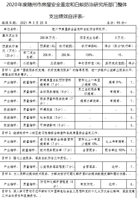 通過評價分析,2020年市房屋安全鑒定和白蟻防治研究所整體支出績效自評報告績效評價綜合得分為95分,評價等級為優。其中預算執行情況得分15分,產出指標得分59分,效益指標得分15分、約束性指標得分6分。