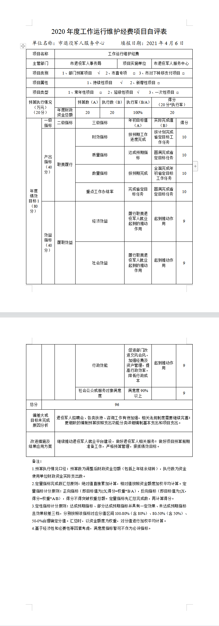 ????根據《2020年市直部門整體支出績效自評表》中績效指標分析評分,隨州市退役軍人服務中心2020年部門整體支出績效自評得96分,績效等級為優(yōu)。?????????????