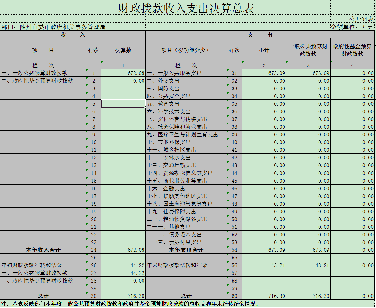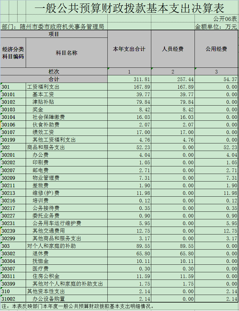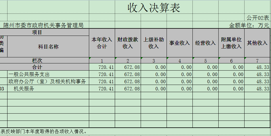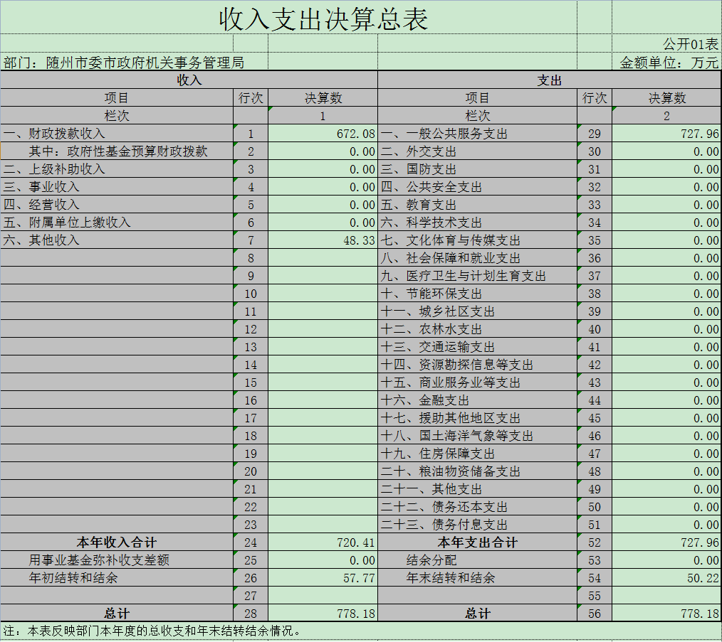 本年度收入720.40萬元,其中財政撥款672.10萬元(基本支出撥款310.80萬元,項目支出撥款361.30萬元),其他收入48.30萬元(光伏發電電費和光伏發電補貼24萬元,收會議中心會議費7萬元,政法委裝修會議室款15萬元,其他2.3萬元)。本年度支出728萬元,其中基本支出366.7萬元(人員經費287.70萬元,日常公用經費79萬元),項目支出361.30萬元(市委市政府后勤服務維修)。上年結轉57.80萬元,本年度結轉50.20萬元。