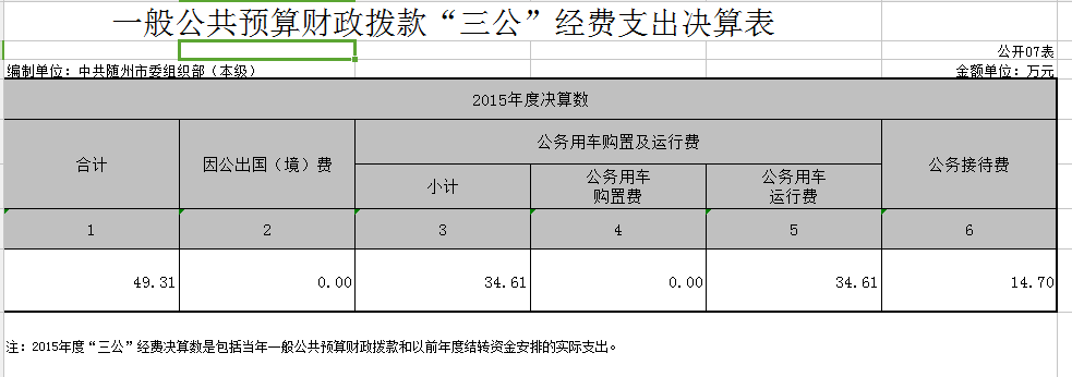 2015年,市委組織部認真落實中央八項規定、國務院“約法三章”和省委、省政府及市委、市政府有關文件精神,厲行節約,精減會議,合理壓縮一般行政性開支,嚴格控制“三公”經費支出,切實減少各項經費開支。