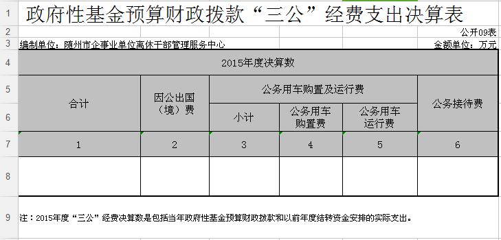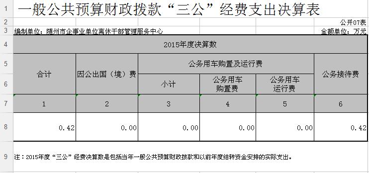 ??2015年市離休干部管理服務中心“三公”經費預算4.47萬元,決算0.42萬元。國內公務接待費用增加導致“三公”經費增加;公務用車購置數0輛,保有量0輛;國內公務接待7批次,57人次;無因公出國(境)情況。
