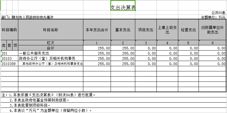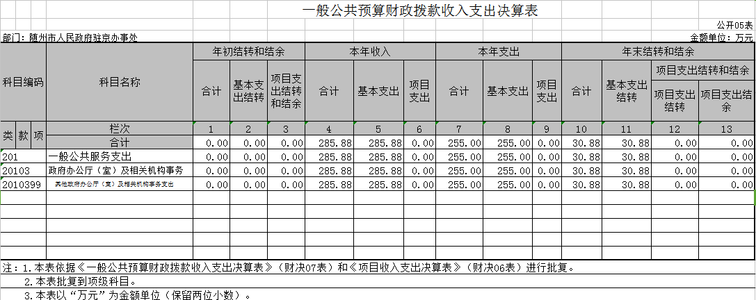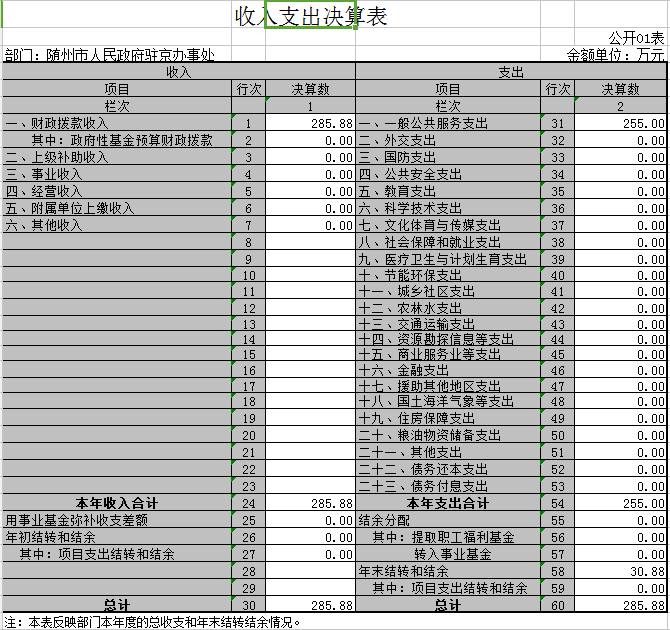 市駐京辦屬全額撥款單位,人員經費按現在人員由財政全額保障,本年度收入285.88萬元,上年度結轉無,總支出255萬元,年末結轉和結余30.88萬元。