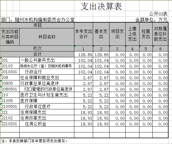 2015年決算收入合計128.86萬元,其中財政撥款收入 126.42萬元,上年結(jié)轉(zhuǎn)和結(jié)余2.44萬元。決算支出合計126.41萬元。其中人員經(jīng)費支出100.45元,日常公用經(jīng)費支出25.96萬元,