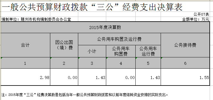 2015年三公經(jīng)費支出2.98萬元,其中:因公出國(境)費用0萬元、公務(wù)用車購置及運行維護(hù)費1.43萬元、公務(wù)接待費1.55萬元。
