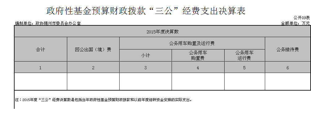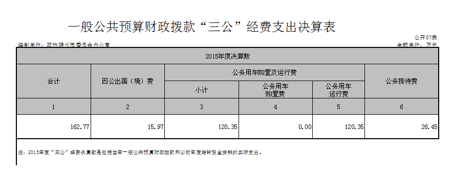 2015年三公經費共162.7萬元。其中,因公出國費用15.97萬元,比2014年減少0.38萬元,降幅2%;公務接待費26.45萬元,比2014年增加5.71萬元,增幅27%,2016年度公務接待共260批次,合計2500人次;公務用車運行維護費120.35萬元,因當年公務用車嚴重老化,維護費用較高,比2014年增加76.15萬元。