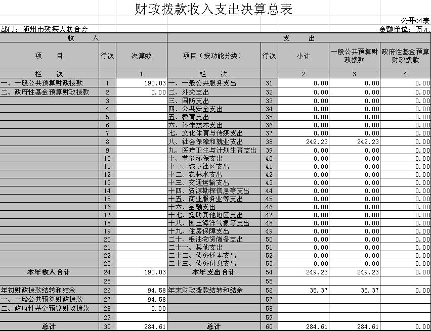 財政撥款收入決算總額284.61萬元(包含上年結轉94.58萬元),支出決算總額249.23萬元,結轉結余35.37萬元。