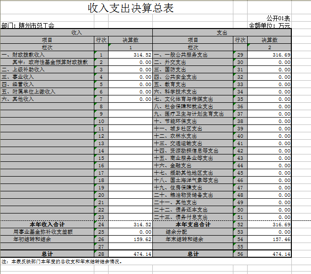 ???? 財政給予市總工會的決算資金主要是財政供養的部分在職人員經費和日常公用經費、離退休人員經費、醫療費、困難職工幫扶經費、省部級勞模生活困難補助經費、退休退養協理員工資以及其他項目經費; 2016市總工會財政收入決算總共314.52萬元;(其中撥款收入314.52萬元;年初結轉和結余159.62萬元;共計474.14萬元);