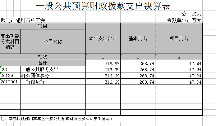 ??? 2016年隨州市總工會全年決算支出為一般公共服務支出316.69萬元,為基本支出268.74萬元和項目支出47.94萬元,占總支出的100%。其中機關工資支出207.98萬元,商品和服務支出39.45萬元。