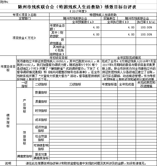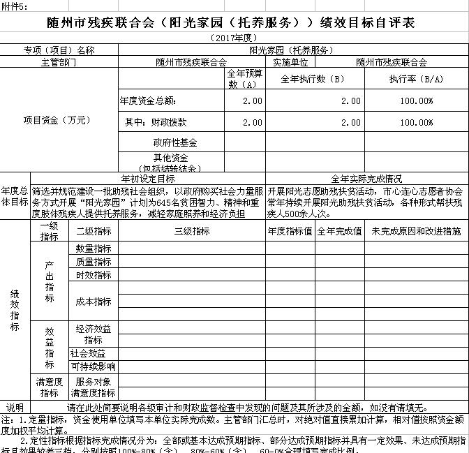 根據(jù)預(yù)算績(jī)效管理要求, 2017年我單位預(yù)算項(xiàng)目6個(gè),項(xiàng)目名稱分別為:殘疾人康復(fù)中心建設(shè)(殘疾人就業(yè)保障金支出)、其他殘疾人事業(yè)支出(含延續(xù)項(xiàng)目)、其他殘疾人事業(yè)支出、特困殘疾人生活救助、陽(yáng)光家園(托養(yǎng)服務(wù))、0-6歲殘疾兒童搶救性康復(fù)。2017年項(xiàng)目預(yù)算數(shù)共計(jì)2072.28萬(wàn)元,收入完成數(shù)共計(jì)851.78萬(wàn)元(其中撥付殘疾人康復(fù)中心600萬(wàn)元;市殘疾人就業(yè)服務(wù)中心60萬(wàn)元;高新區(qū)殘聯(lián)20萬(wàn)元。)