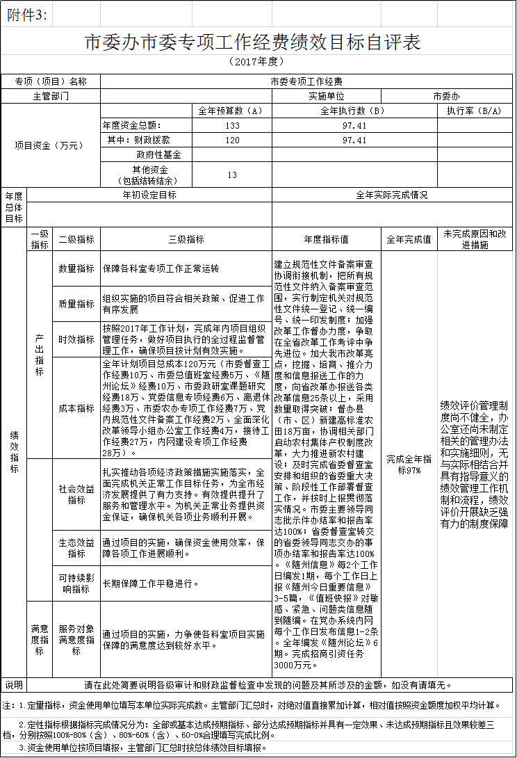????7、關于2017年度預算績效情況的說明。根據預算績效管理要求,我單位對2017年度一般公共預算項目支出全面開展了績效自評,共涉及項目1個(市委專項工作經費),資金133萬元(含上年結余結轉13萬元),專項資金到位率100%,到位及時率100%。本著節約原則,我辦從嚴控制經費支出,力求把專項經費用在刀刃上,實際支出97.41萬元,沒有出現超支現象。在資金使用方面,嚴格制定和執行了財務管理核算制度,資金使用規范,相關資料齊全,無挪用、截留經費的情況發生。在專項資金管理方面,建立了嚴格的資金管理制度,提高了監管水平。專項資金保質保量、規范高效的實施,加強了領導干部思想政治建設,提高了干部職工的理論水平和工作能力,保障了各科室專項業務的正常運轉。