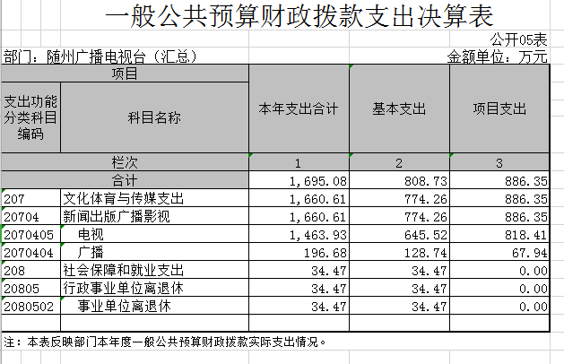 隨州廣播電視臺系統匯總2017年財政撥款支出決算數1695.08萬元,較上年增加767.2萬元,增加82.68%,和2017年預算(1102.51萬元)相比增加了592.57萬元,增加53.75%,主要原因是增加了人員經費支出及《魅力中國城》等突發性項目支出,其中基本支出808.73萬元,項目支出886.35萬元。