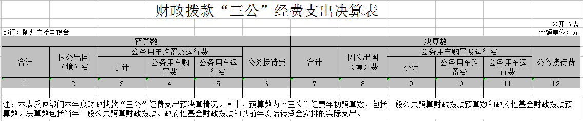 隨州廣播電視臺系統匯總2017年度財政撥款“三公”經費無支出,年初預算數為0,和預算無差異,上年度財政撥款“三公”經費支出合計2.73萬元,我臺在2017年度用事業收入支出公務車費用,較上年減少100%,控制費用支出,用事業收入彌補經費不足。