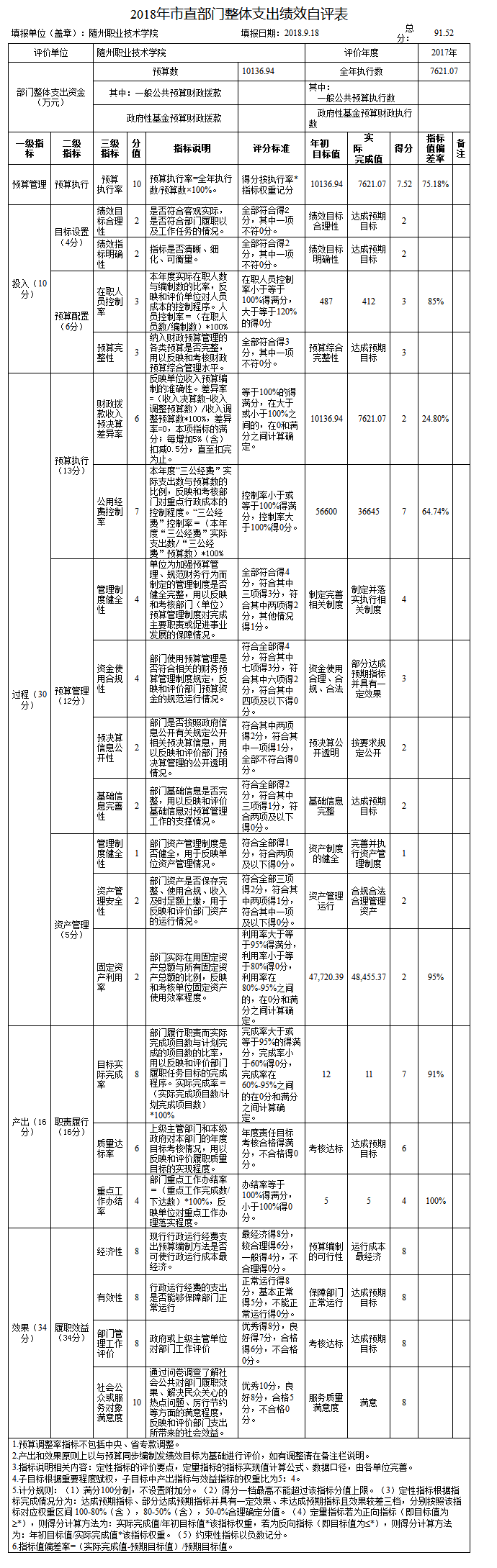??根據《市財政局關于2018年開展財政支出績效評價的通知》精神,單位成立了績效評價工作專班,組織開展了整體支出績效評價,整體得分91.52分,基本完成各項指標年初目標值,情況較好。