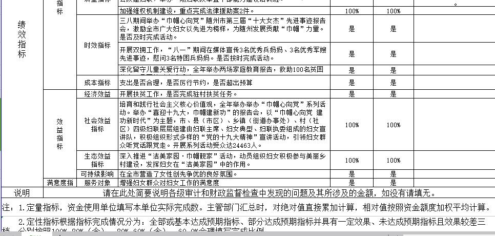 ??發現的問題及原因:預算實際執行情況與預算目標之間存在偏差,主要原因是2017年婦女兒童工作項目實施中優先使用了2016年結余資金68.175萬元,另有2017年度部分婦女兒童工作項目資金尾款未支付,所以造成2017年婦女兒童工作項目資金使用有41.04萬元的結余資金。