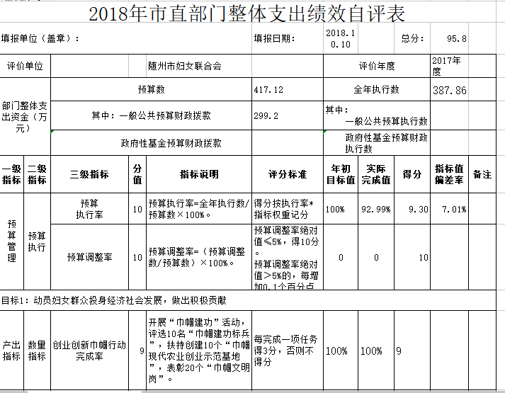 ??為進一步加強和規范婦女工作經費項目資金的管理,根據市財政局《市財政局關于2018年開展財政支出績效評價工作的通知》隨財發【2018】16號文件的精神和要求,市婦聯成立專班,組織相關專業人員對我單位整體支出情況及產生的社會效益進行了績效自評。根據預算績效管理要求,我會組織對2017年度一般公共預算全面開展績效自評,共涉及項目1個,2017年預算資金共計417.12萬元,2017年實際支出數366.05萬元,占一般公共預算支出總額的87.76%。