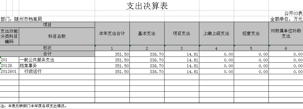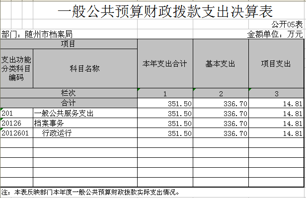 ??2017年部門一般公共預算財政撥款收入637.44萬元,比年初預算570.90增加了66.53萬元,一般公共預算財政撥款支出351.50萬元,比年初預算減少了285.94萬元;其中:基本支出336.70萬元,比年初預算266.86萬元增加了69.84萬元;項目支出14.81萬元,比年初預算304.05萬元減少289.24萬元,一般公共預算財政撥款支出增加的主要原因是按照政策規定將未列入預算的人員經費從一般公共預算財政撥款中調增預算。