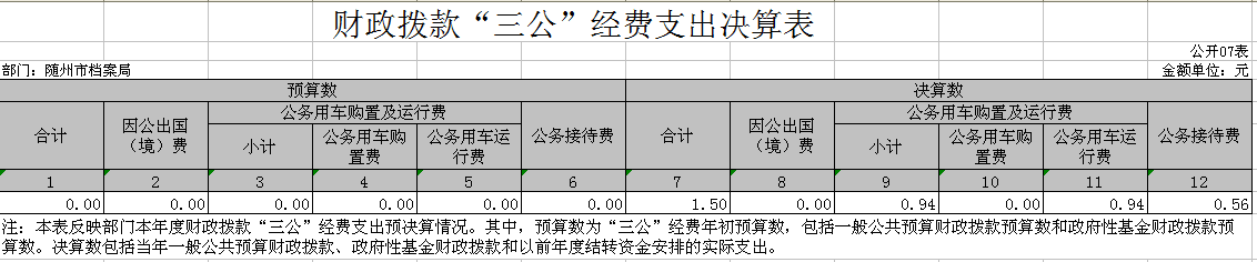 ??2017年隨州市檔案局“三公”經費合計1.50萬元,比上年的3.01萬元減少了1.51萬元。2017年隨州市檔案局公務用車保有量1輛,未購置公務用車,公務車運行維護經費0.94萬元,比上年減少0.76萬元,同比降低44.71%,主要原因是嚴格執行部門預算,從嚴控制支出范圍和標準;公務接待費0.56萬元,比上年減少0.75萬元,同比降低57.25%,主要是因為單位嚴格公務接待支出制度,盡量壓縮公務接待支出。全年公務接待累計接待約7批次,接待人數約50人次。2017年無因公出國費用。