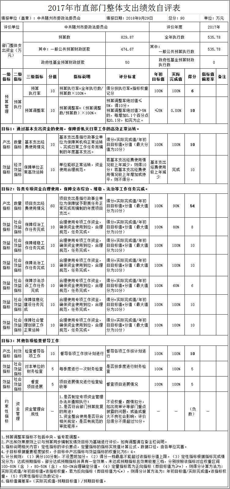 2017年度市委政法部門整體支出績效評價自評得分為 90分,績效等級為優。2017年單位全年預算數收入829.87萬元,實際支出535.78萬元,完成預算64.56%。取得的主要成效:保障機構正常運轉和年度工作任務完成,為隨州建設經濟轉型升級和創新驅動示范城市、打造特色產業增長極提供了優良的法治環境。存在的主要問題:項目年度預算執行率偏低。其主要原因:一方面,我單位在支出過程中厲行節約,壓縮開支;另一方面,由于項目費用大部分用于保障基層基礎建設,項目建設周期長且具有延續性,使得部分項目支出當年不能全部完成,故預算執行率偏低。下一步改進措施:及時調整優化后續項目及下年度預算支出的方向和結構,進一步加強財務管理,規范資金使用,提高年度預算執行率,特別是大力提高年度項目預算經費的執行率。