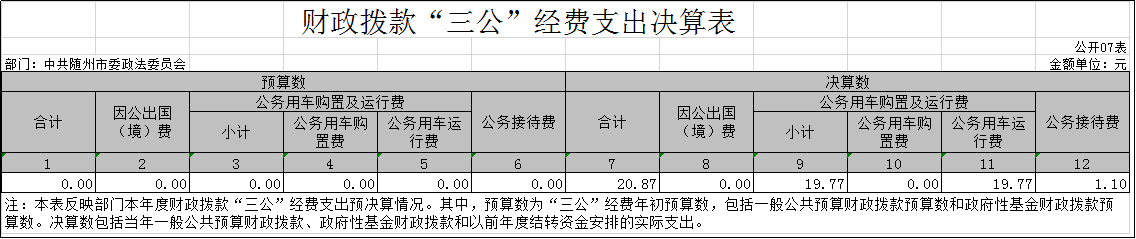 2017年度本單位“三公”經費年初預算5.12萬元,其中:公務接待費1.61萬元、因公出國(境)費1.70萬元、公務用車運行費1.8萬元。本年度實際支出“三公”經費20.87萬元,其中:公務接待費1.10萬元、公務用車運行費1.79萬元、公務用車購置費17.98萬元,沒有出國(境)費。同比2016年公務用車運行費基本持平;公務接待費增加0.49萬元,增長30.43%,主要原因是:2017年省、市維穩任務繁重,上級工作組來隨督導、市召開維穩會議增多,公務接待費用相應增加,2017年單位公務接待共23批次120人;公務用車購置費增加17.98萬元,增長100%,主要原因是:原公務用車到達報廢年限,故障頻出且無法徹底修復,影響正常工作,2017年12月新購置公務用車1臺,該車為單位現有的1臺公務用車。