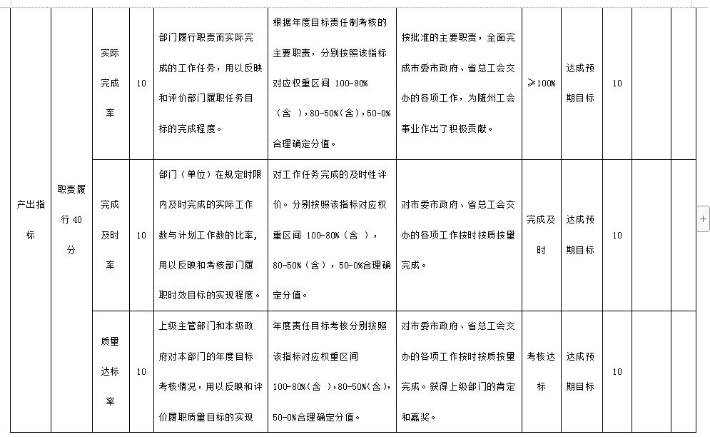 ??根據市總工會工作職責的特殊性,一些工作是無法用具體量化指標來衡量,我們結合實際情況,根據各部門履行職責而實際完成的工作情