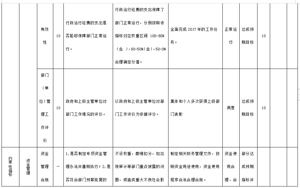 經費的支出是否能夠保障部門正常運行的有效性,政府和上級主管單位對部門工作情況的評價等三方面進行考核評分,除經濟性扣3.8分外,