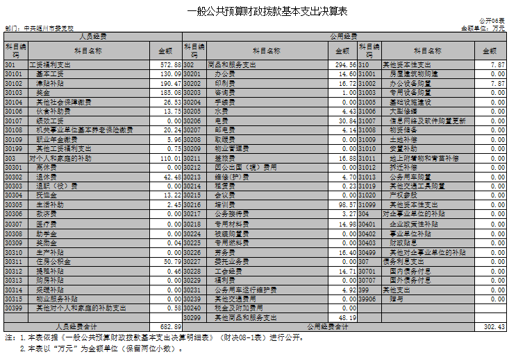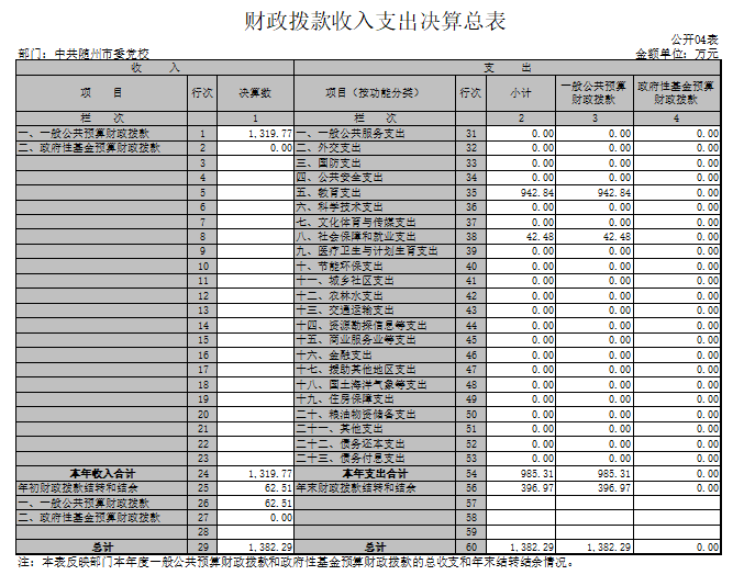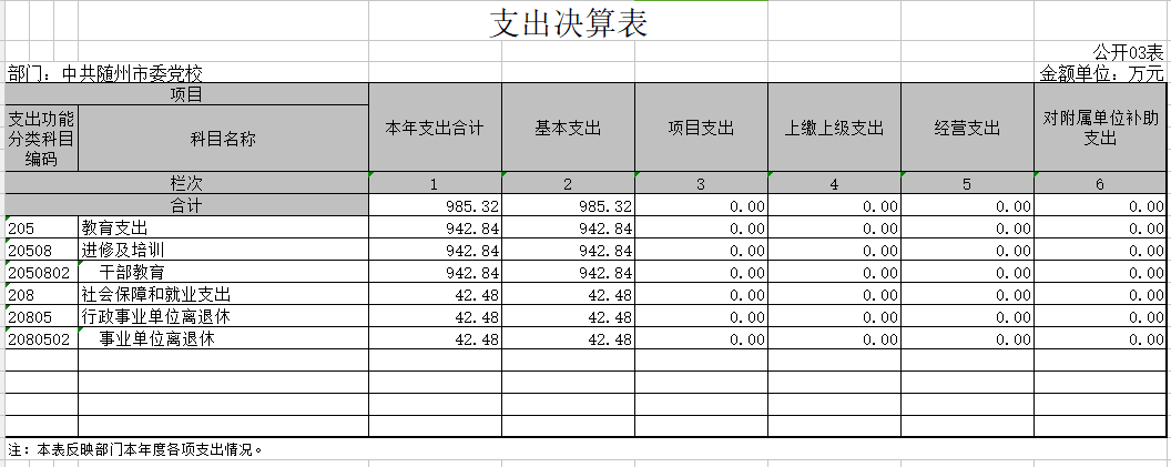 2017年度一般公共財政撥款支出985.32萬元,其中教育支出942.84萬元,占一般公共財政撥款支出的95.69%;社會保障和就業支出42.48萬元,占一般公共財政撥款支出的4.31%。財政撥款決算支出比年初支出預算的3804.71萬元少2819.39萬元,主要原因是市委黨校新校園尚未建設好,“新校區教學設備購置”的2500萬元項目支出經費市財政未下達。