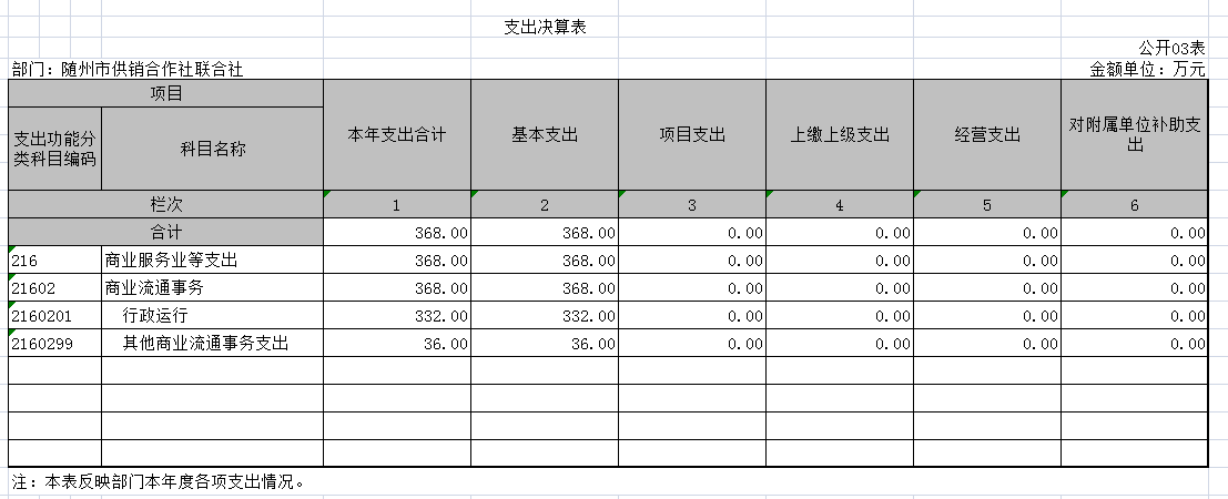 2017年部門支出368萬元,比2016年350.80萬元增加17.2萬元,增加的主要因素是人員工資增加調整;比年初預算365.3 萬元增加2.7萬元。增加的主要因素是人員工資調整追加預算撥款收入;其中:基本支出338萬元,用于單位正常運轉的支出;項目支出30萬元,用于新農村現代流通網絡建設工程等項目經費的支出。
