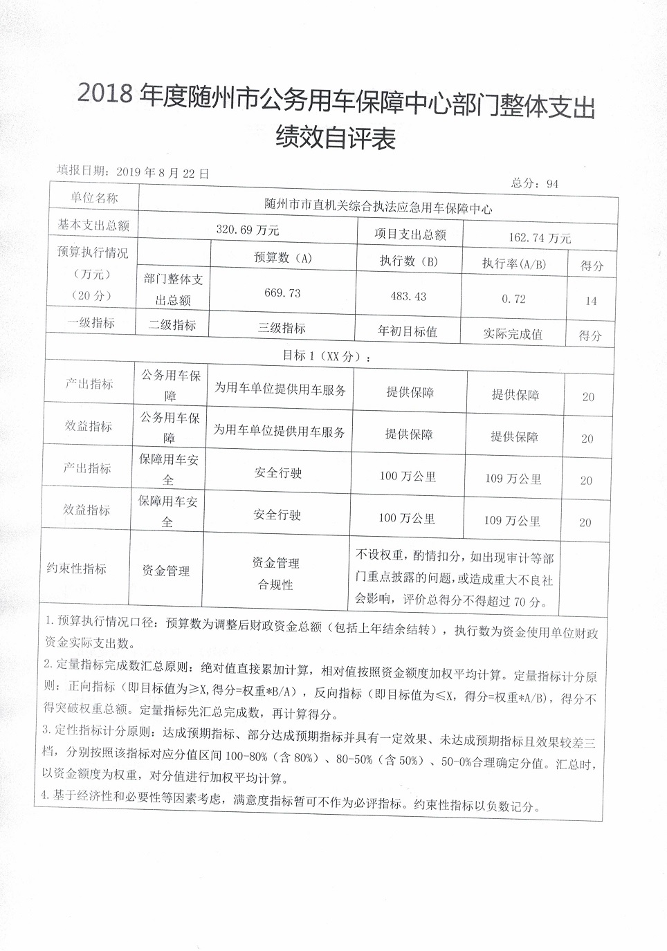 五、2018年度市公務用車保障中心部門整體支出績效自評表