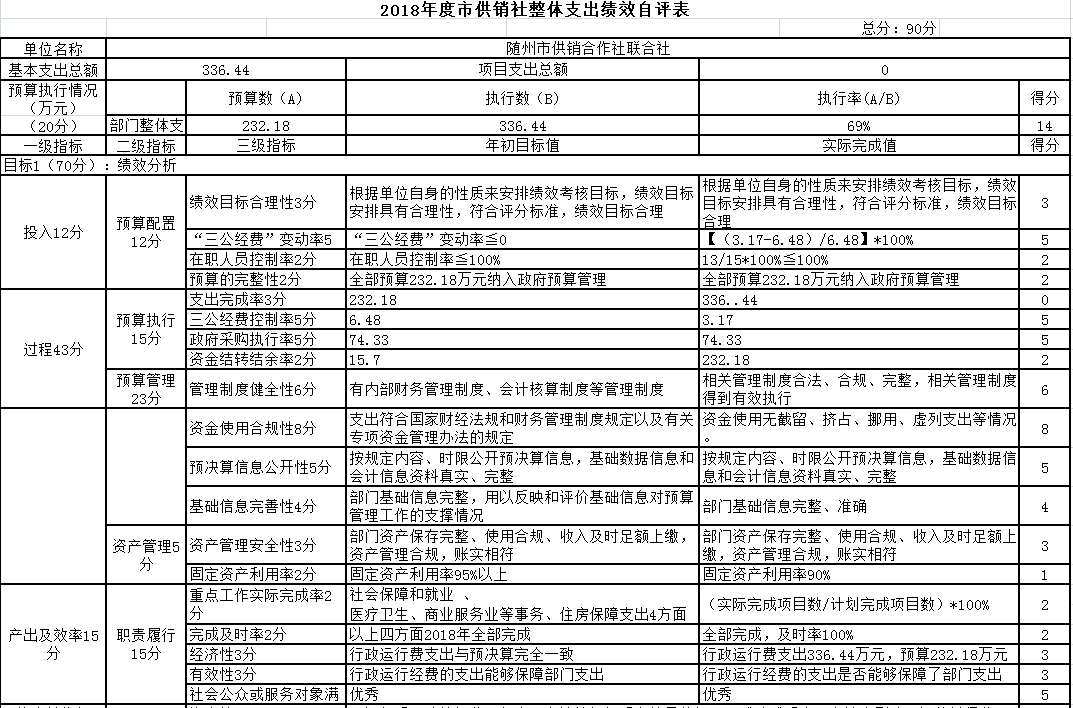 根據(jù)預(yù)算績(jī)效管理要求,我單位組織對(duì)2018年度市本級(jí)預(yù)算部門的整體支出進(jìn)行績(jī)效自評(píng),經(jīng)評(píng)價(jià),整體支出績(jī)效評(píng)價(jià)總分為90分,評(píng)價(jià)結(jié)果類型為A,績(jī)效評(píng)價(jià)結(jié)果級(jí)別為優(yōu)。具體情況如下: