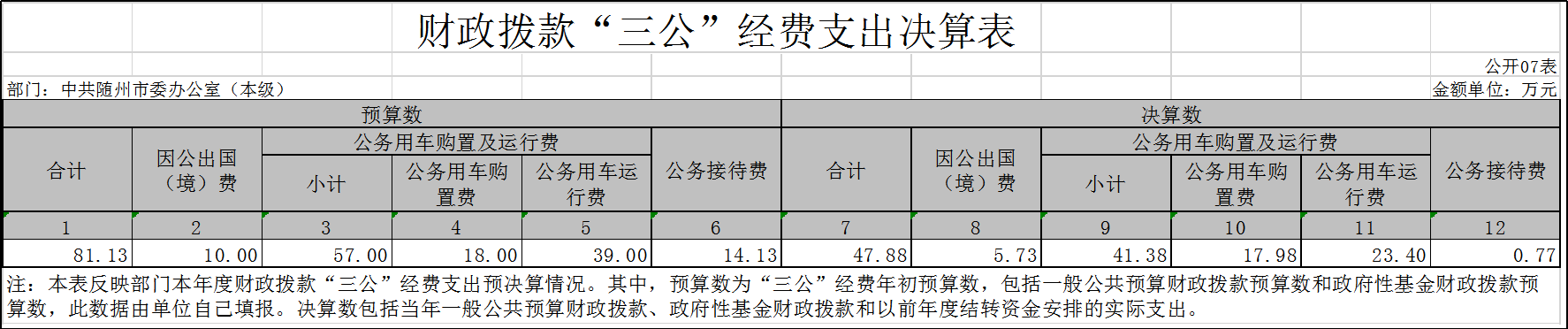 1、“三公經費”全年總預算數為81.13萬元,比上年預算數減少20.91萬元,減少20%(其中公務接待14.13萬元,減少17.26萬元;因公出國10萬元,增加3.4萬元;公務車運行維護費57萬元,減少7.05萬元)。全年實際支出47.88萬元,比上年的53.15萬元降低10%。本年度因公出國(境)一人一批次支出5.73萬元;公務車運行維護費41.38萬元,比上年的47.93萬元減少6.55萬元,本年度新購置公務用車一輛17.98萬元;公務接待12批次86人,支出0.77萬元較上年的5.23萬元減少4.46萬元。減少的原因是市委辦公室貫徹落實中央八項規定和省委、省政府、市委、市政府關于厲行節約的要求,進一步從嚴控制“三公”經費開支。