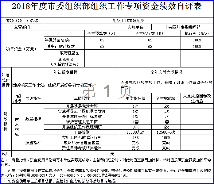 ??組織工作專項經費項目績效自評綜述:項目全年預算數為62萬元,執行數為62萬元,完成預算的100%。主要產出和效果:圍繞年度工作計劃,領導班子和領導干部履職盡責管理、黨建考評迎檢、責任目標考核、干部人事制度改革、組織工作課題調研、干部培訓教育、大組工網維護等工作完成較好,成效比較明顯,有力保障了全年組織工作重點任務的完成。發現的問題及原因:項目設置不夠細化。主要原因是根據承擔工作進行大項設置,沒有細化到具體工作項目。下一步改進措施:結合工作實際,進一步合理設置項目。