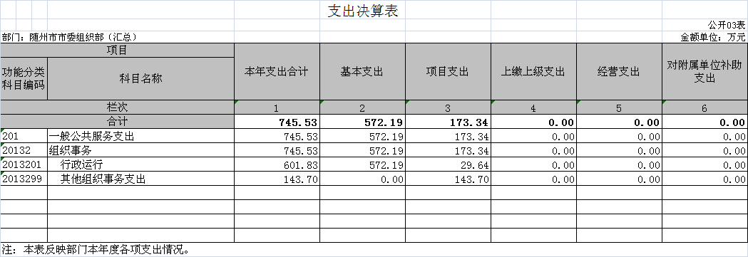 ??隨州市委組織部2018年度部門(匯總)支出總計843.42萬元,其中本年支出合計745.53萬元,較上年上升2.55%,主要原因是:本年度支出與上年基本持平;年末結轉和結余97.89萬元,較上年下降48.26%,主要原因是:2017年度延續項目在本年度支出。