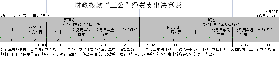 ??隨州市委組織部部門(本級)一般公共預算財政撥款“三公”經費支出年初預算數為9.8萬元,決算數為9.02萬元,完成預算的92.04%,決算數較上年下降46.63%,其中:(1)2018年度本部門無因公出國(境)情況。因公出國(境)支出年初預算數為0萬元,決算數為0萬元。(2)2018年度本部門國內公務接待45個批次196人次。公務接待費支出年初預算數為2.7萬元,決算數為2.06萬元,完成預算的76.29%,決算數較上年下降66.73%。主要原因是:嚴格執行中央八項規定,嚴控經費支出。(3)2018年度本部門公務用車保有量2臺,沒有新購置公務用車。公務用車購置及運行維護費支出年初預算數為7.1萬元,其中公務用車購置年初預算數為0萬元,決算數為0萬元。公務用車運行維護費年初預算數為7.1萬元,決算數為6.96萬元,完成預算的98.03%,決算數較上年下降35.05%。主要原因是:嚴格執行中央八項規定,嚴控經費支出。