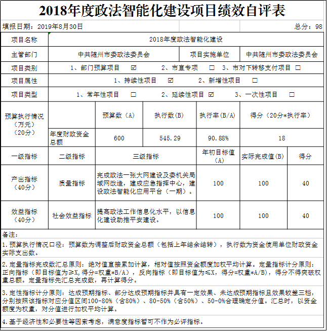 2018年本單位政法智能化建設項目全年預算為600萬元,實際執行數為545.29萬元,完成預算數90.88%。主要產出和效益:初步建成一張縱向貫通、橫向聯通的隨州市政法綜合信息網,建立政法數據中心和集維穩中心、綜治中心、網格中心、視頻會議、指揮調度等為一體的多功能應急指揮平臺,積極配合對接省委政法委信息系統,打造了隨州特色的政法業務支撐體系、政法為民服務支撐體系和安全運維體系,全力推動了政法機關網絡互通、資源整合、信息共享、業務協同。發現的問題和原因:項目績效指標設計需進一步加強,項目績效指標設計多為定性指標,缺乏定量指標;項目管理制度需進一步完善,具體項目支出有待科學規劃。下一步改進措施:在年度預算績效申報時將年度工作任務細化分解為具體的工作目標,采取定量的方式制定清晰、可衡量的績效指標,并通過完善制度管理來協調項目建設,保證項目長遠目標的貫徹執行和預定目標的實現。