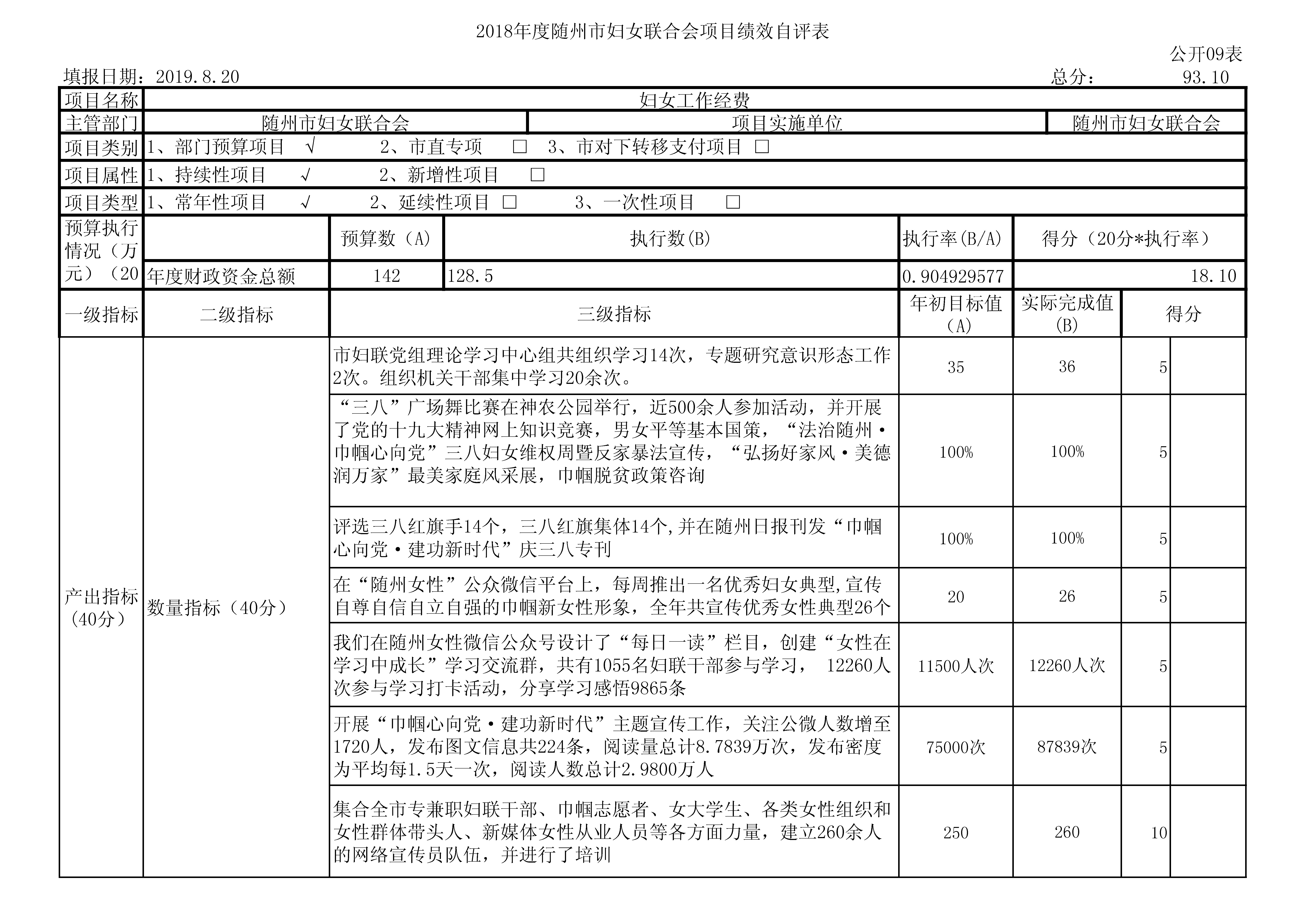 為進一步加強和規范婦女工作經費項目資金的管理,根據市財政局《市財政局關于2018年開展財政支出績效評價工作的通知》隨財發【2019】9號文件的精神和要求,市婦聯成立專班,組織相關專業人員對我單位整體支出情況及產生的社會效益進行了績效自評。根據預算績效管理要求,我會組織對2018年度一般公共預算全面開展績效自評,2018年年初預算資金共計288.25萬元,2018年實際收到資金308.26萬元,實際支出數296.62萬元,一般公共預算支出261.63萬元占支出總額的88.20%。從評價情況來看,我會2018年度部門整體支出績效評價自評結果為“優秀”。
